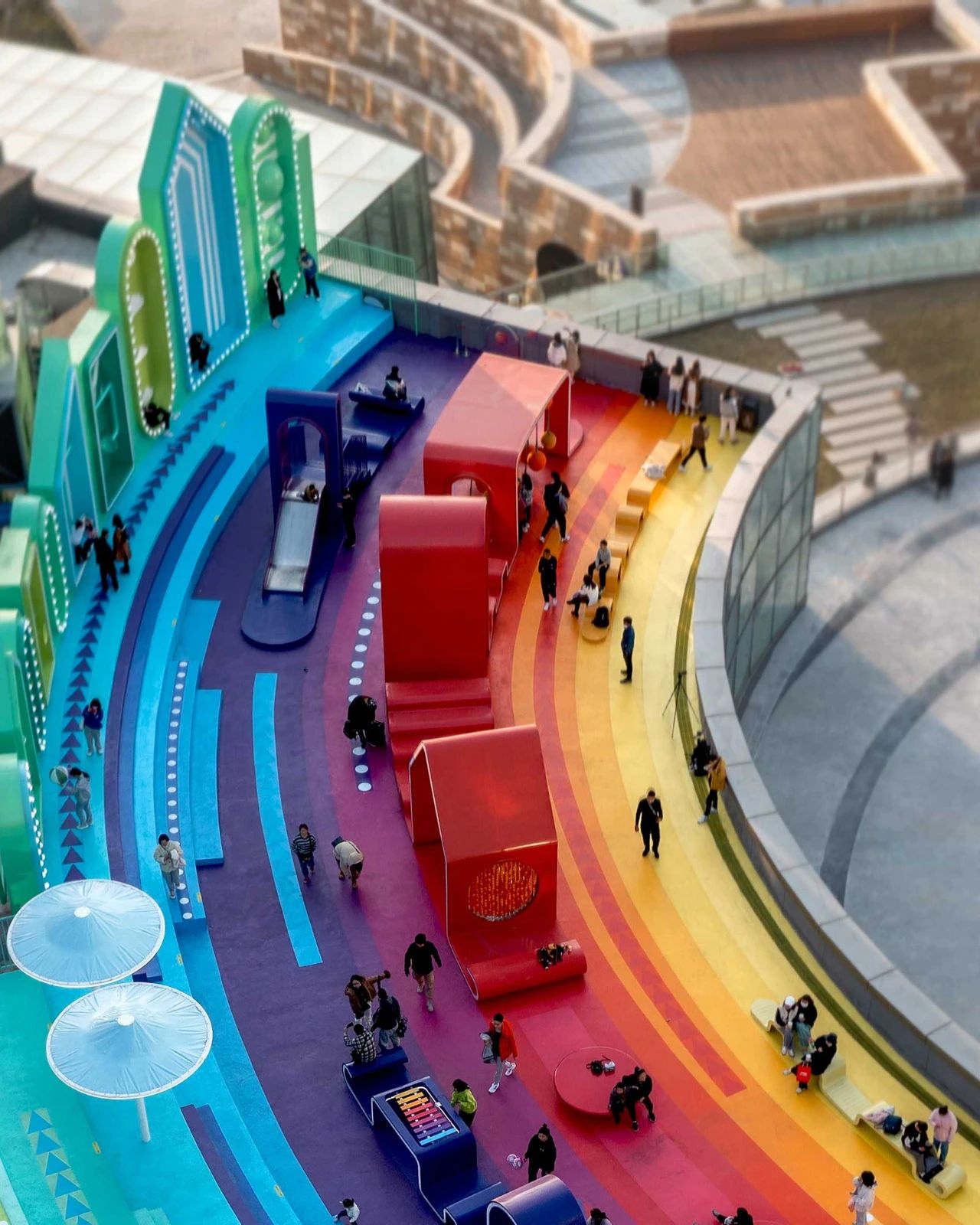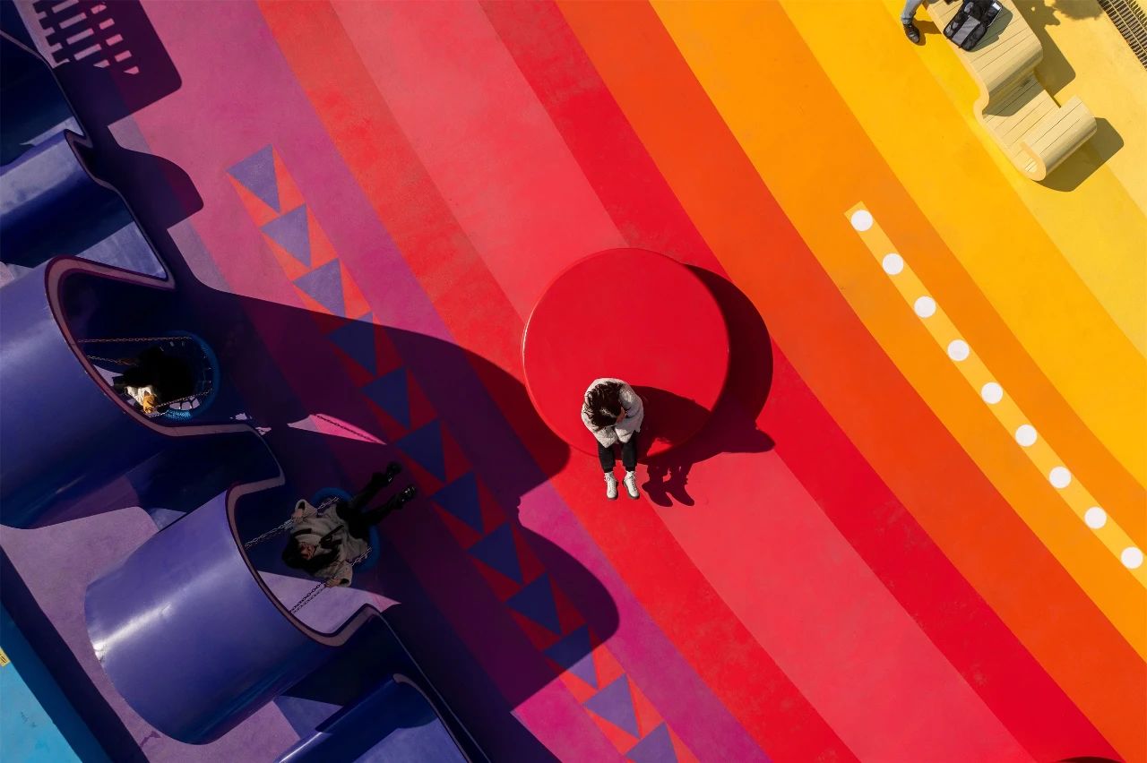 利用屋頂圓弧的造型,設(shè)計(jì)師用不同顏色的彩帶平行地鋪滿地面,增強(qiáng)弧形的視覺(jué)效果,從而形成了一道設(shè)置了多項(xiàng)互動(dòng)活動(dòng)功能的絢麗彩虹。每條彩帶都被賦予了不同的顏色,承載了不同的功能和活動(dòng),通過(guò)休閑與活動(dòng),促進(jìn)社交與互動(dòng)。這些彩帶既作為流線地面二維圖案引導(dǎo)人行動(dòng)線,同時(shí)在局部隆起部分變?yōu)槿S的城市家具、游玩結(jié)構(gòu)與休閑裝置。